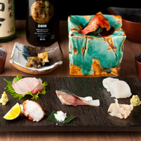 お酒に合う人気メニュー7品の「おまかせコース」 (お通し2種、丸かじり野菜 〜自家製おかか味噌〜、お刺身盛り合わせ-5点盛、 魚介の塩おでん、または煮付け、酒肴三点盛り、蟹味噌クリームコロッケ、〆の一品) |